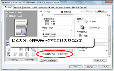 印刷設定内にある”印刷時にプレビューを表示する”のチェックを入れた状態にすると機能がONになります。確認したいときだけプレビュー機能を使用する場合には、チェックを外して必要に応じてチェックを入れプレビュー機能をご使用ください。