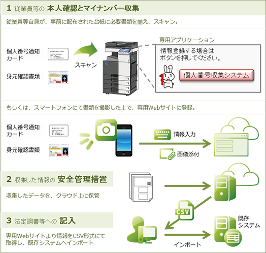コニカミノルタが提供するのは、個人番号収集の際の作業負担を軽減し、安全に保管するためのサービスです。従業員自らが必要な情報を入力すればあとは自動的にデータを集めることができ、その情報は安全に管理されたクラウド上に保管されますので、この一連の作業に携わる部門の担当者の負担を軽減することができます。作業工程が削減されることから、情報管理の上でも有効です。情報の入力作業は、コニカミノルタの複合機※1、あるいはスマートフォンから簡単に行えます。