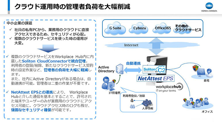 今回のソリューションは、ソリトンシステムズが持つ「Soliton CloudConnector」と「NetAttest EPS」を、コニカミノルタが開発中の、働き方変革を実現する次世代のプラットフォームとなる「Workplace Hub」上で稼働させることで、中小企業におけるクラウド運用時のIT管理者の大幅な負荷軽減を実現するものです。