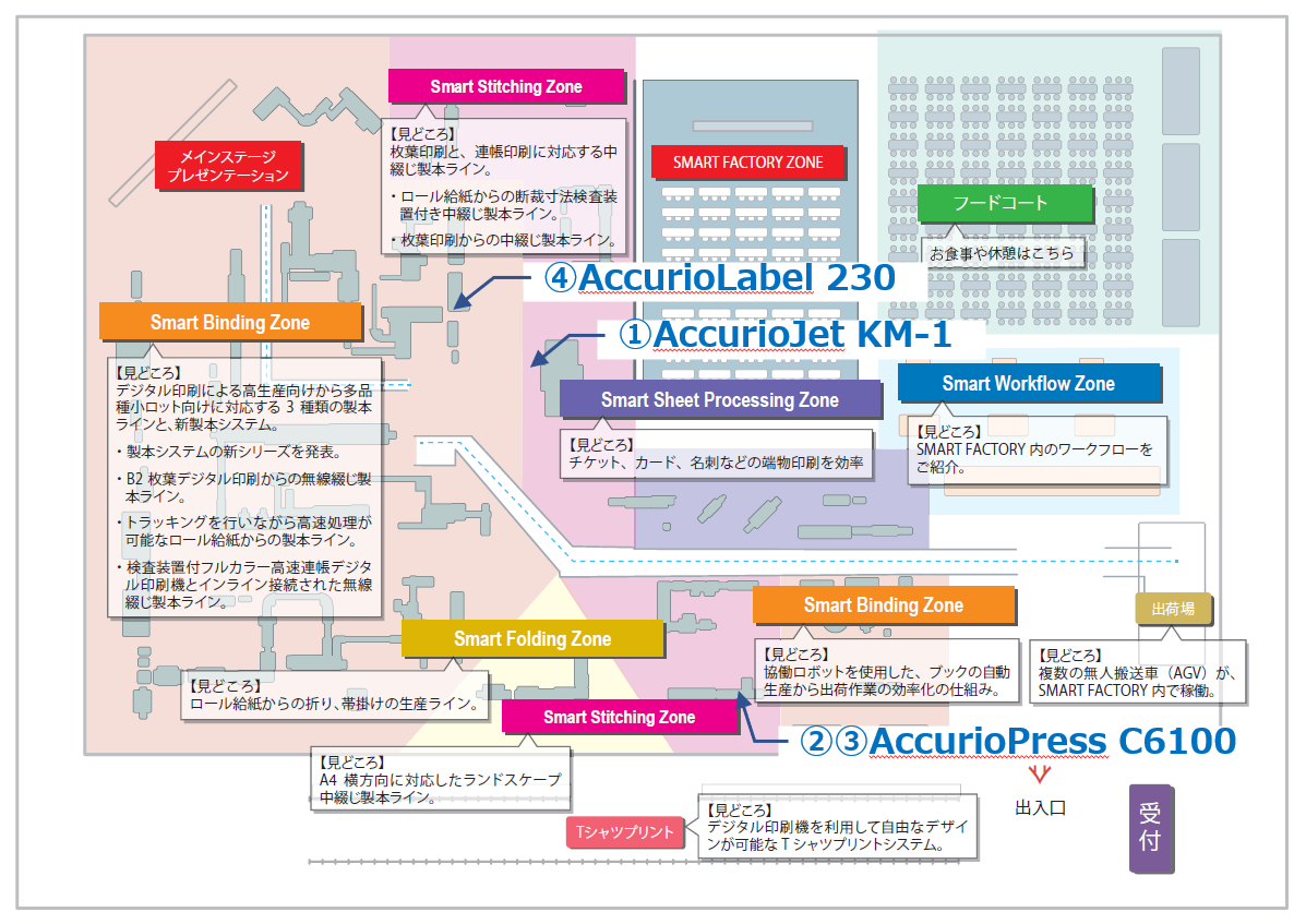 | 出展製品 | ①枚葉デジタル無線綴じ製本ライン AccurioJet KM-1 A4版(24頁)とA5版(36頁)の無線綴じ製本仕上げジョブをPrintSapiens(JSPIRITS)からのJDFを元に、EQUIOS(ScreenGA)で面付・製版処理したデータを「AccurioJet KM-1」で印刷し、枚葉デジタル無線綴じ製本ライン(ホリゾン)を活用してJDFの指示通りにセット変更しながらA4版とA5版の無線綴じ製本加工する。 ②枚葉中綴じ製本ライン AccurioPress C6100(IQ-501) EQUIOS(ScreenGA) から出力されたA4版(16頁)横見開き(ランドスケープ)中綴じ面付データとJDFを元に「AccurioPress C6100」で印刷し、枚葉中綴じ製本ライン(ホリゾン)で中綴じ三方断裁して仕上げる。 ③デジタルパッケージ印刷加工ライン AccurioPress C6100(IQ-501) お菓子のパッケージが4面付されたデータを「AccurioPress C6100」で厚紙用紙に印刷し、ロータリーダイカット加工ライン(ホリゾン)で型抜き・抜きカスの分離排出までワンパス処理する。 ④デジタルラベル印刷加工ライン AccurioLabel 230、DC330mini(GM社製) 各種ラベルやシールを「AccurioLabel 230」デジタル印刷機で高速且つ高品質に印刷し、「DC330mini」で型抜き・抜きカス分離排出まで一括処理する。 |