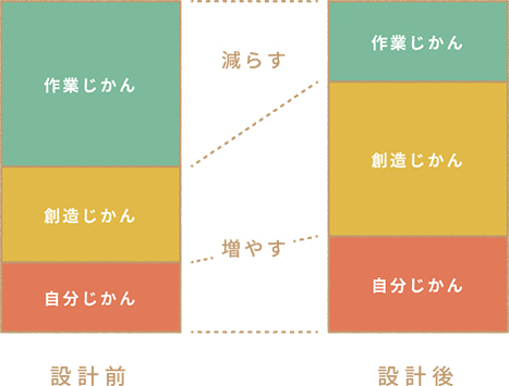 働く人の時間を分解していくと、作業をコツコツこなす「作業じかん」、新しいアイデアを生み出す「創造じかん」、そして休み、育み、学び、視野を広げる「自分じかん」の3つがあると考えています。一般的な働き方改革の考え方は、主にこの「作業じかん」を減らすことに注目することが多いようですが、減らすだけでなく、「創造じかん」「自分じかん」といった、「いいじかん」を増やすこと、すなわち、生産性・創造性を高めることが重要だと考えています。そのために、今後も、自社実践と、その知見を活かしたお客様へのサービスの提供をおこなってまいります。