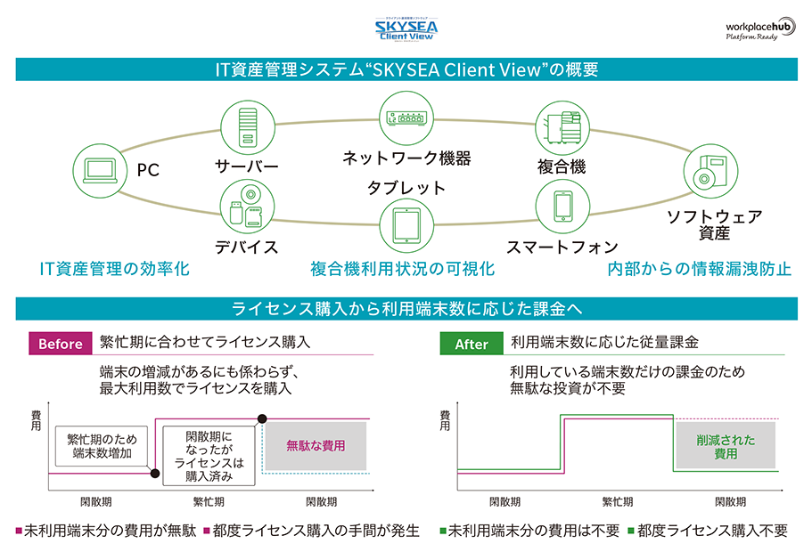 「SKYSEA Client View」は、日本の企業におけるコンピューターの利用状況に合わせて開発されたIT資産管理機能やセキュリティリスクに対する多層防御の機能などを有します。また、コニカミノルタ複合機と連携することで、毎月の使用量を可視化でき、複雑なITシステムの構築なしに、IT資産管理、コスト管理、情報セキュリティ対策をまとめて提供することが可能です。