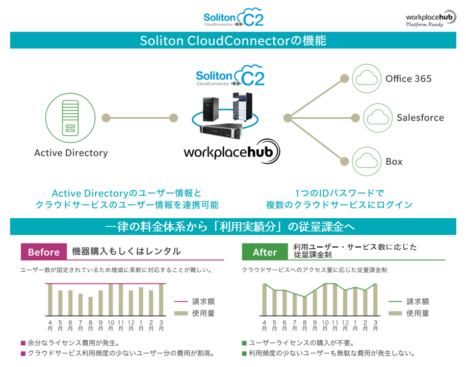 Workplace Hub プラットフォームの従量課金機能に対応することで、月内の稼動端末数に応じた課金が可能となり、故障中の端末などが除外されるため、実際に利用した端末分だけのコストに最適化されます。 - 「Soliton CloudConnector」(ソリトンシステムズ)