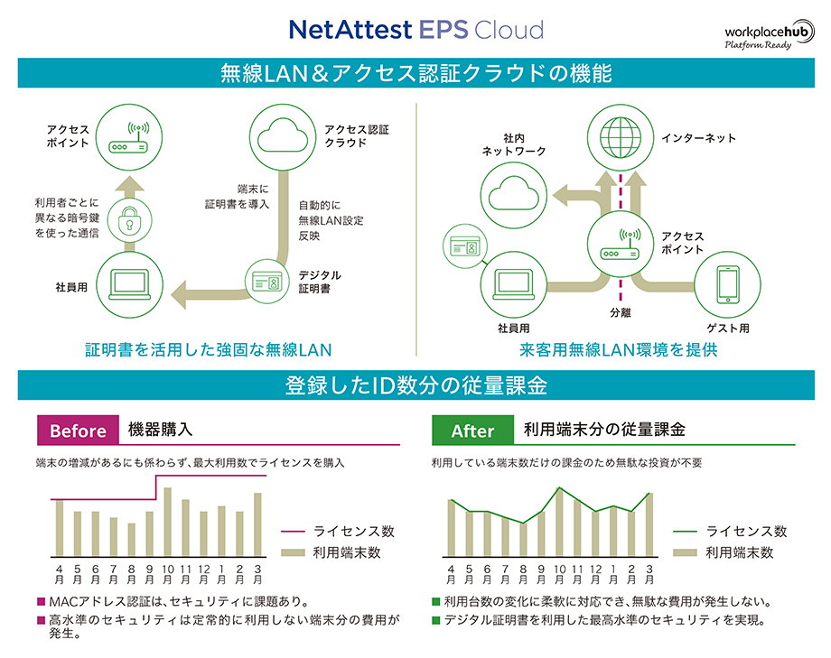 Workplace Hub プラットフォーム対応により、初期投資を大幅に圧縮するとともに、毎月使用しているクラウドのサービス数と、月内に利用したユーザー数による従量課金となることで、コストも最適化されます。 - 「NetAttest EPS Cloud」(ソリトンシステムズ)