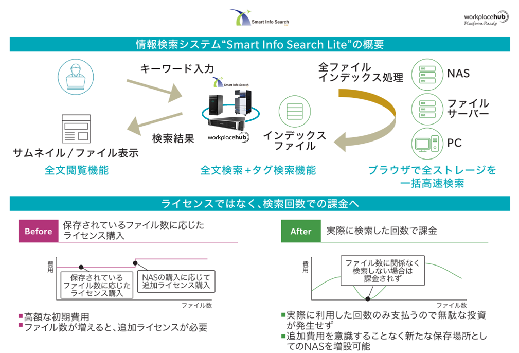 Workplace Hubプラットフォームの従量課金対応で、保存ファイル数に関係なく、単純に検索回数と拡大表示回数に応じた課金が可能となり、コストの大幅圧縮と最適化に大きく寄与します。