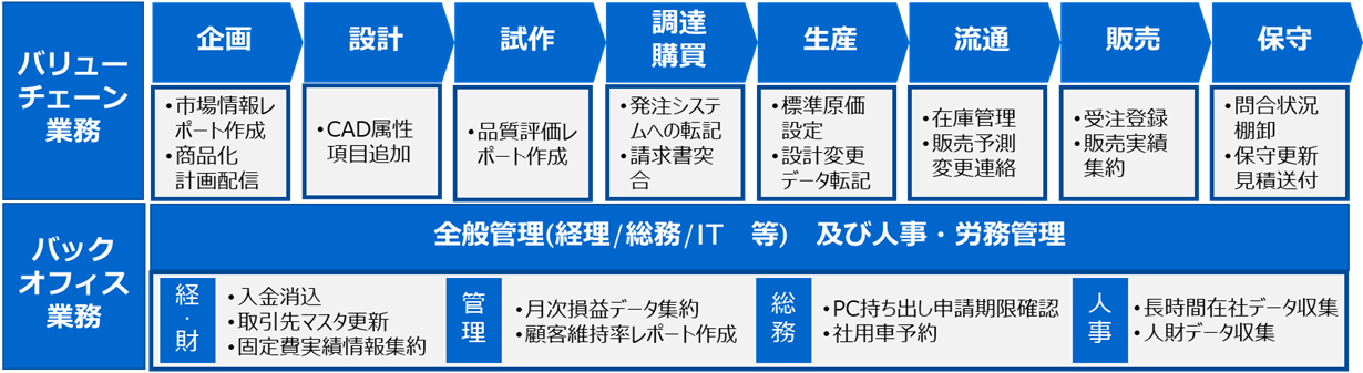 - バリューチェーン業務とバックオフィス業務:下図(2017年よりRPAを導入した自社実践業務)