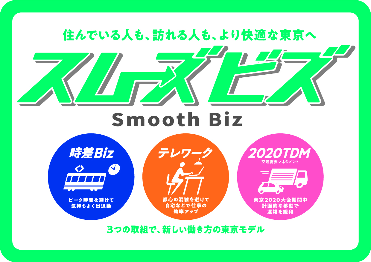 「スムーズビズ」は、東京都が推進する東京2020大会の交通混雑緩和に向けた「交通需要マネジメント(TDM)」「テレワーク」「時差Biz」などの取り組みの総称です。