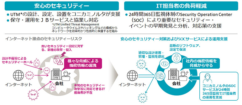 ITセキュリティーの運用・管理者を増やすことなく、セキュリティー脅威の検知・分析・対処から保守までのサービスをワンストップで提供します。コニカミノルタジャパンがUTM※の設計、設定、設置までを支援するほか、保守・運用はJBサービスと協業して対応していきます。オプションのSOCサービスを利用することで、セキュリティー設定のバックアップやファームウェアの更新を行いサイバー攻撃のリスクを軽減します。さらには、ITセキュリティー製品の設定・管理・運用業務をリモートで行い迅速な対応により重要なセキュリティーイベントの早期発見と分析、対応策の支援を行っていきます。