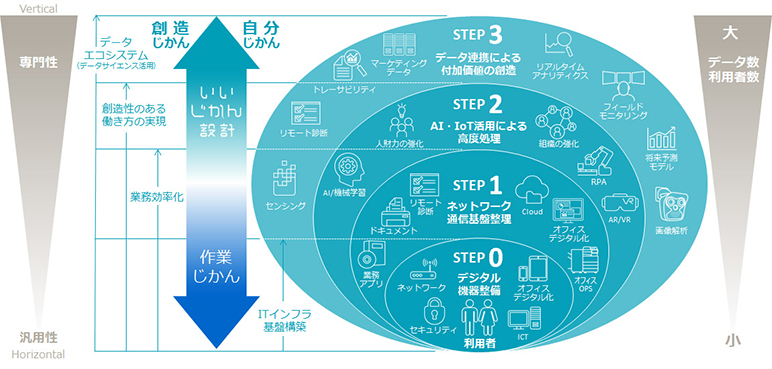 コニカミノルタジャパンは、Intelligent Connected Workplace 構想のもと、働き方改革の自社実践で得た知見とノウハウを集約した「いいじかん設計」によって進化させたITサービス、Workplace Hub、複合機を提供し、顧客の新しい働き方を提案していきます。「いいじかん設計」は、企業のIT基盤構築支援から業務プロセスの生産性向上、創造性を高める新しい働き方の実現へと提供範囲を順次拡大させながら進化しております。またさらにその先の人とナレッジをつなぐデータ連携、分析、利活用まで拡大することで、新たな価値創造を生み出し、あらゆるワークプレイスの 「未来の『はたらく』をデザイン」します。