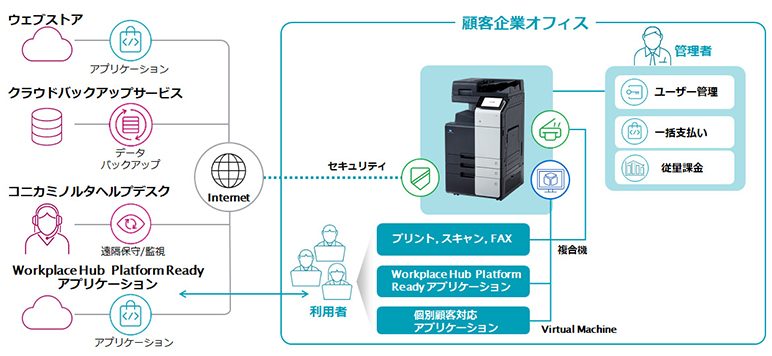 Workplace Hub Smart では、複合機と Workplace Hub プラットフォームの統合により、複合機の機能とITサービス、IT保守・運用をシームレスに統合したサービスを提供します。Workplace Hub プラットフォームは、オンプレミス環境とクラウド環境とを統合したハイブリッドクラウド環境を提供しており、クラウド版およびオンプレミス版の Workplace Hub Platform Ready アプリケーションをシームレスに利用することができます。複合機やアプリケーションの利用情報をクラウド基盤に集約することで、請求を一本化できるため管理者の手間を省力化することができます。また、高度なセキュリティーの確保と遠隔監視・遠隔保守による窓口の一本化、さらに初期コストを抑えて必要なアプリケーションを気軽に利用できる従量課金制が、利用者とIT管理者双方の生産性向上を実現します。