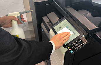 コニカミノルタ製 複合機において、使用時に触れる機会が多い操作パネルや給紙部の取手など重点的に塗布します。塗布作業は専門知識を習得したコニカミノルタジャパンのスタッフが実施します。作業完了後、施工済みシールを貼付けします。