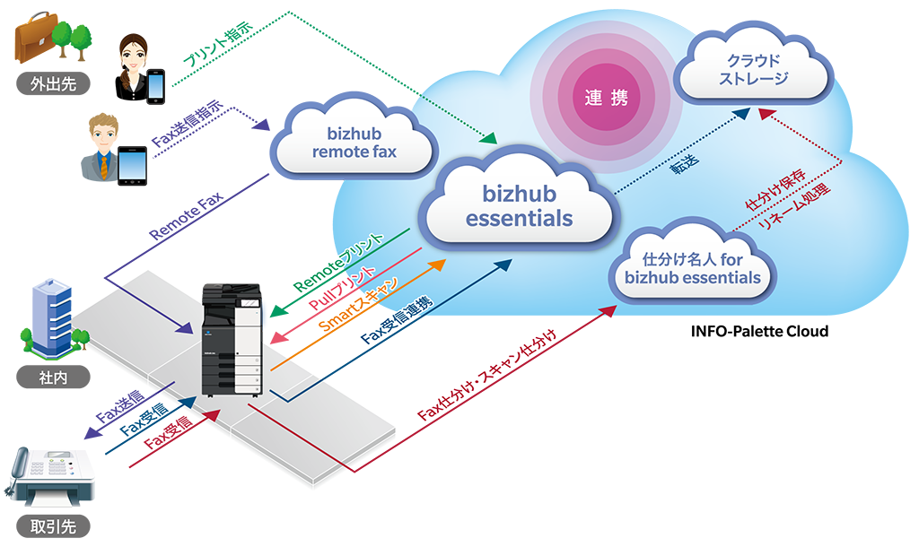 コニカミノルタが提供するクラウドプラットフォーム「INFO-Palette Cloud」の複合機連携機能「bizhub essentials」を利用することで、利用者はクラウドを介して、オフィスの複合機からの出力や、スキャンした紙文書をリモートで確認することができます。また、複合機で受信したFAX文書は自動的にクラウドストレージ※1にアップロードされるため、自宅や外出先でもFAX文書をタイムリーに確認することが可能です。