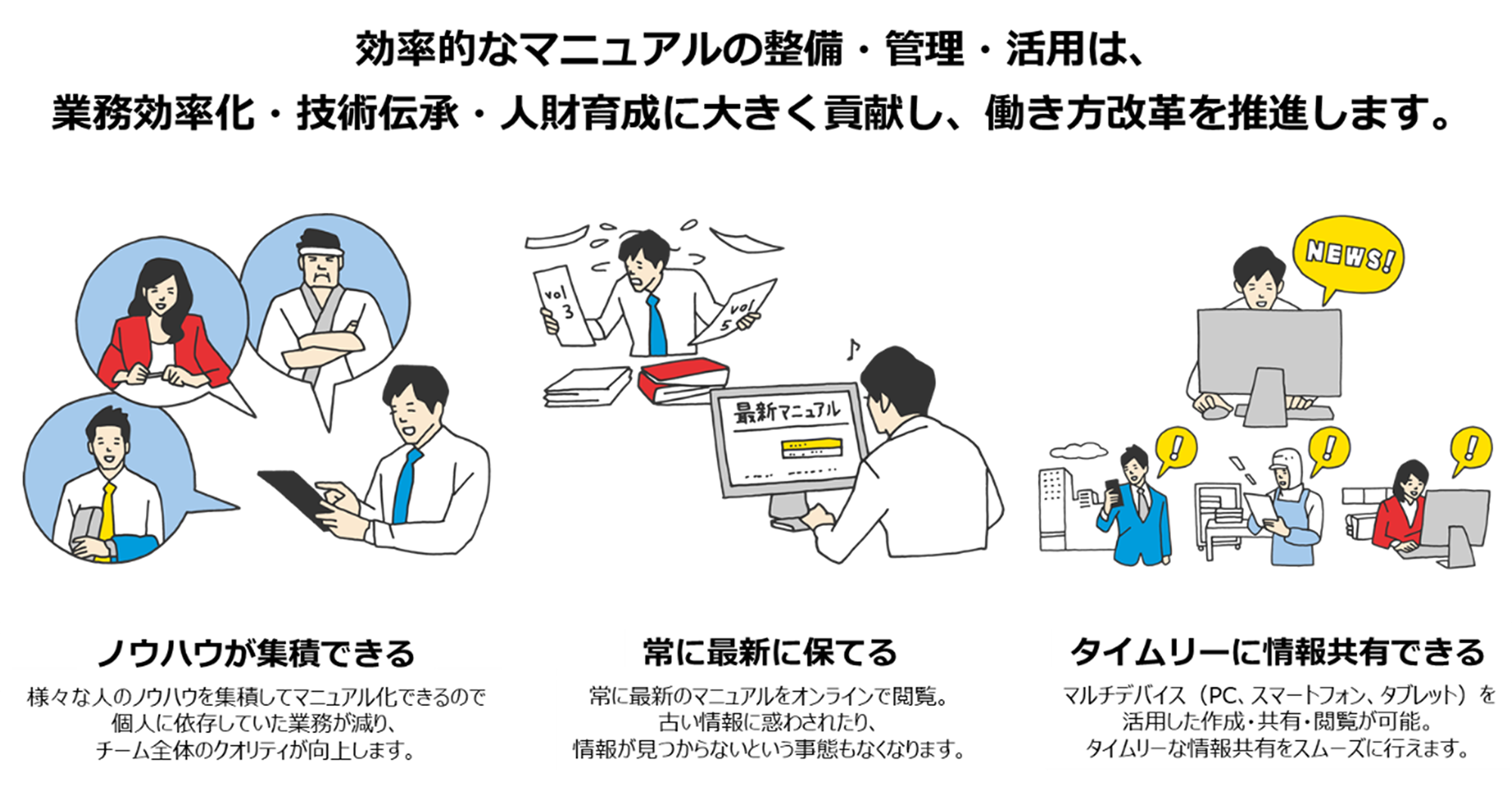 オンラインで分かりやすいマニュアルを作成、運用することで、「いつでも、どこでも、だれとでも」共有できるソリューションです。COCOMITE導入によって、管理者は画像、動画を活用した情報伝達力の高いマニュアル作成が可能となるほか、マニュアルの履歴管理、ユーザーアクセス管理が簡便になります。またユーザーは、キーワード検索して知りたい情報に素早くアクセスし、ユーザー同士で簡単に情報共有が可能になります。マニュアルのPDCAサイクルを効果的に回すCOCOMITEは、効率的なマニュアル整備・管理・活用を促進し、業務効率化・技術伝承・人財育成に大きく貢献し、働き方改革を推進します。