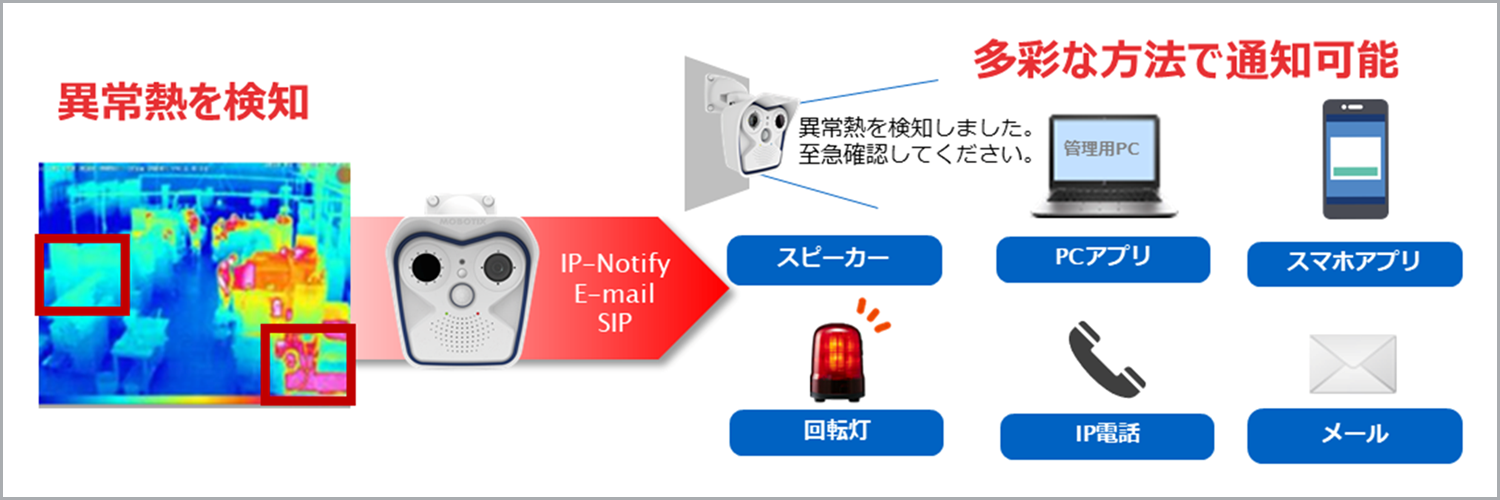 異常熱を検知するとMOBOTIXのスピーカーからの通知に加え、あらかじめ設定しておいたパソコン、スマートフォン、回転灯など様々な方法で通知が可能です。