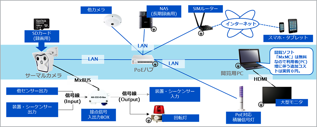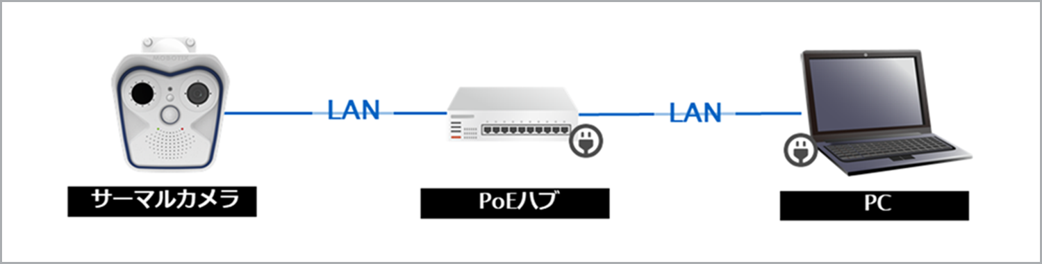 MOBOTIX本体とPoEハブ、パソコンから利用できます。
