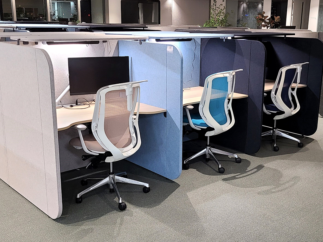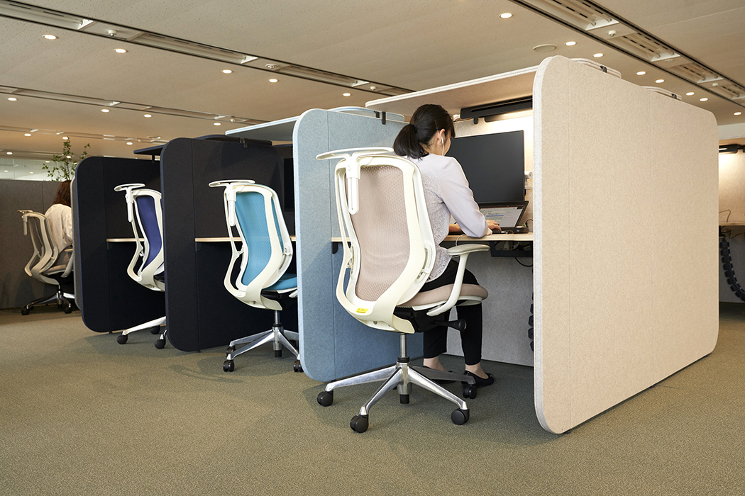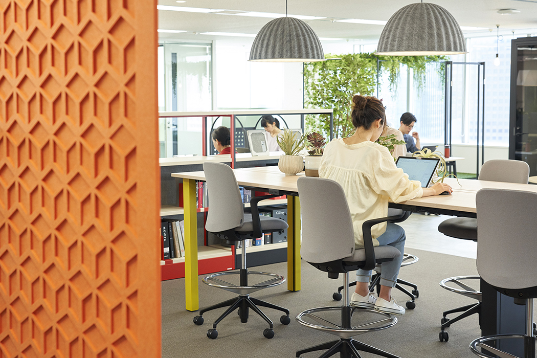 High Focusエリアでは、集中しやすい環境とは何かを考え、照明、配色、音を考えられた空間になっています。温かみのある照明と異なるアースカラーの家具、景色の良い席などを設置。また、サウンドマスキングを導入し周囲の会話や音に配慮した環境を実現します。こうした取り組みが、集中力にどのような差がでるのかを検証していきます。