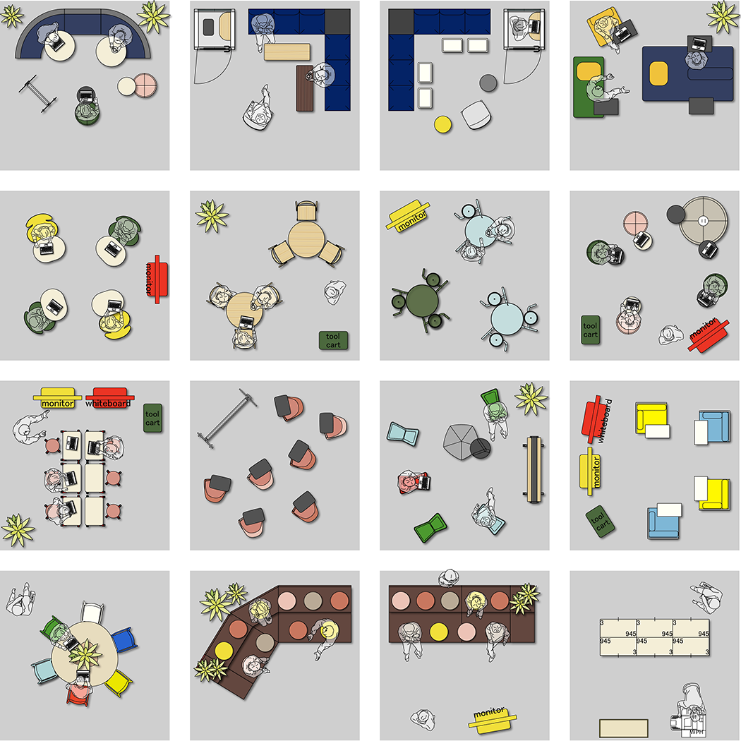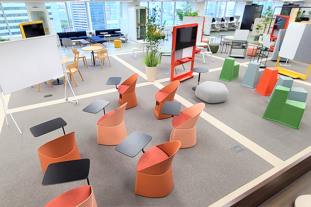 図2:各グリッド(区画)に異なる家具・ツールを配置。ミーティングの人数により利用するグリッド数を変更できるアジャイルなレイアウト