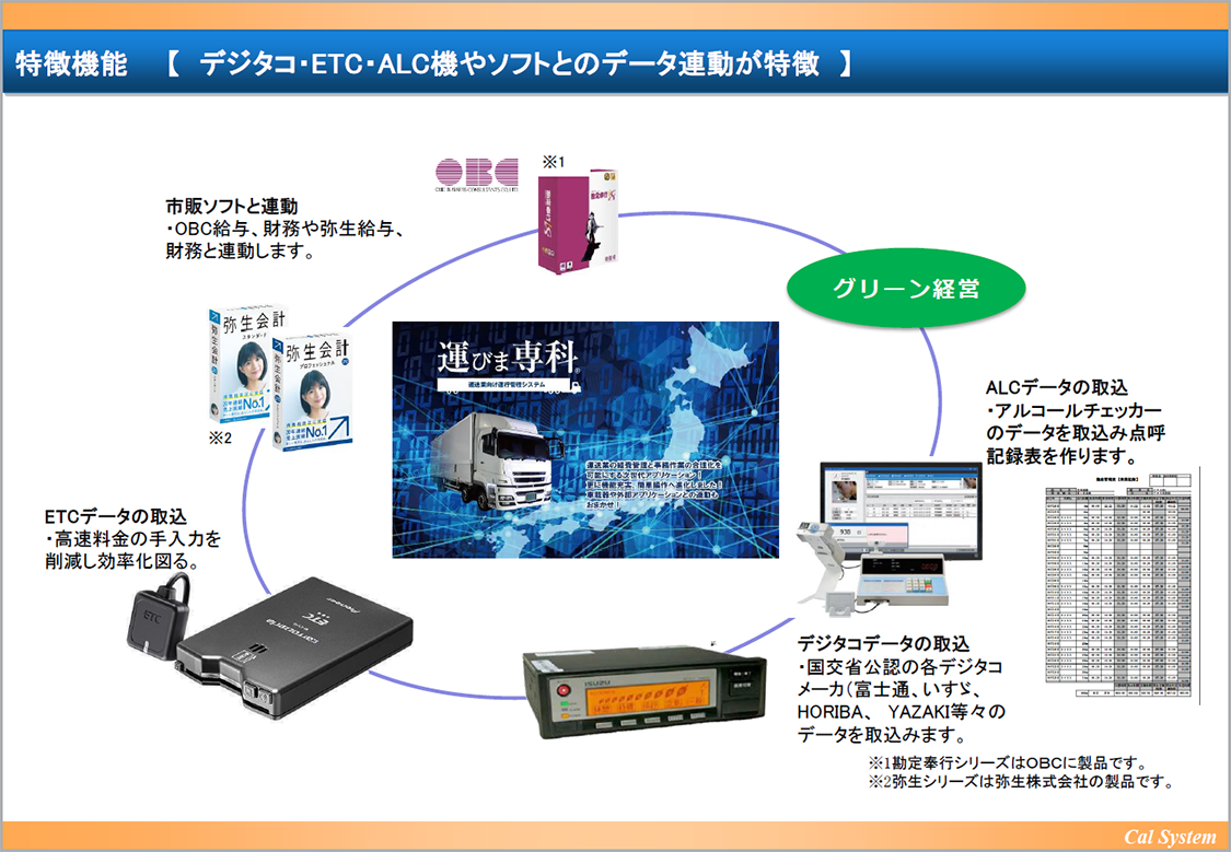 - デジタコをはじめ外部アプリケーション(給与計算ソフト、会計ソフト、アルコールチェッカー、ETC)とデータの連携が可能で、必要なデータの受け渡しが簡単にできます。