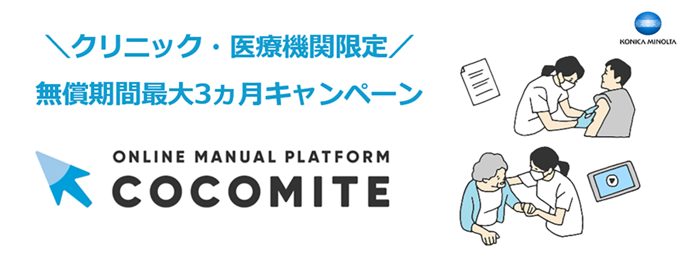 コニカミノルタジャパン株式会社(本社:東京都港区、社長:大須賀 健、以下コニカミノルタジャパン)は、オンラインマニュアルサービス「COCOMITE」のトライアル版を、2021年10月13日(水)よりクリニック・医療機関限定で最大3カ月無償提供します。また無償提供開始に先立ち、サービスの特徴を分かりやすく紹介する WebCM を、「COCOMITE」YouTube 公式チャンネルで10月1日より公開しました。