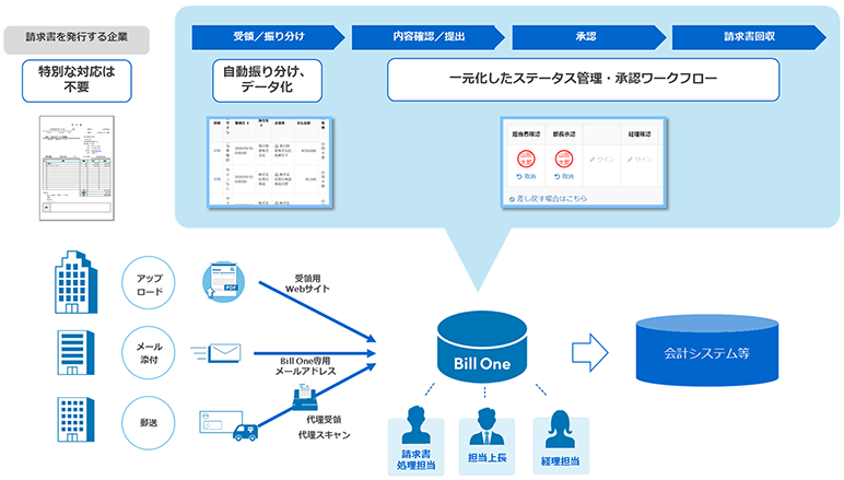 さまざまな形式・方法で送付される請求書をBill Oneが集約します。 - 99.9%の精度でデータ化