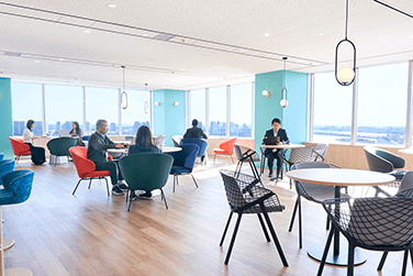 「High Community」には社員やお客様が利用できるカフェスペースがあります。お客様との打ち合わせはもちろん、社員も利用しやすい内装にリニューアルしました。カフェドリンクの香りやデザイン性に優れた家具、オフィスから見える東京湾の景色など、心身をリフレッシュさせる仕組みが、上司や仲間とのオープンな会話やお互いの理解を深めやすくし、社員エンゲージメントの向上につながります。
