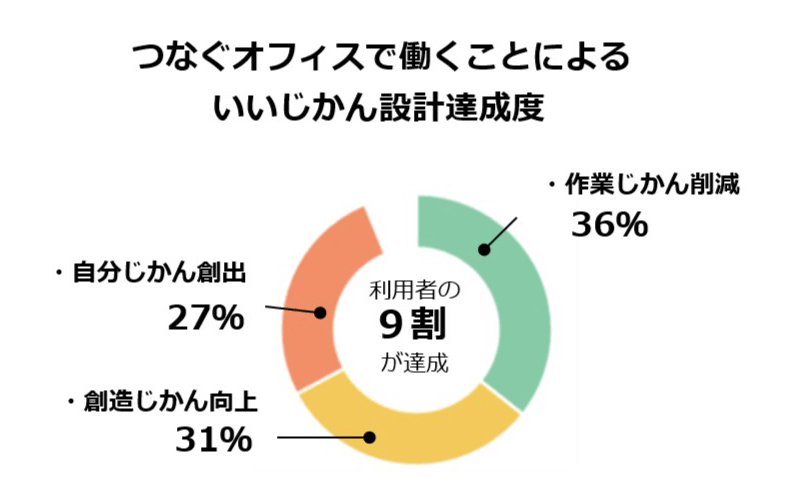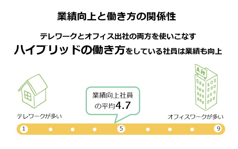 2021年7月には、上記7つの「High」エリアのうち、「High Focus」、「High Collaboration」、「High Creativity」、「High Function」、「High Secure」を先行してオープンしました。オープン半年後に行ったアンケート調査※から、ハイブリッドな働き方を実施した社員には業績向上を実現している割合が多いことや、その日の業務目的に応じてつなぐオフィスの各エリアを利用することで「いいじかん設計」の考え方に沿った働き方を実現した社員が9割以上いることが分かりました。