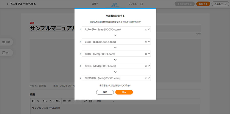 マニュアルの公開時に、承認者を設定し承認フローを実行できます。承認者がマニュアルを確認し、承認をするとマニュアルが公開されます。