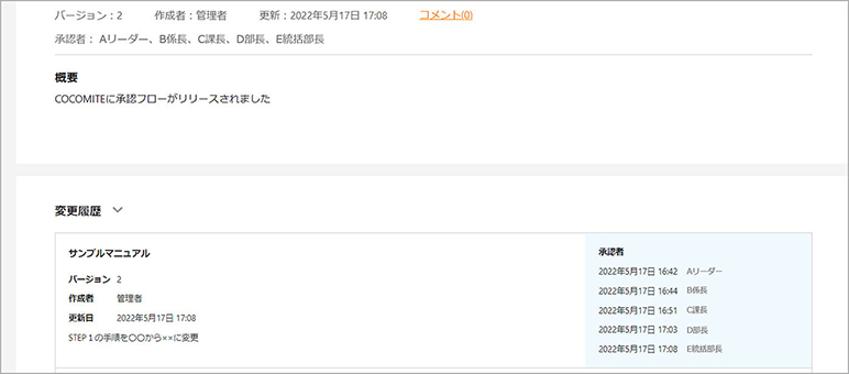 承認後は変更履歴にバージョン・作成者・更新日・更新メモ(任意)に加え、承認者・承認日時も記載されます。