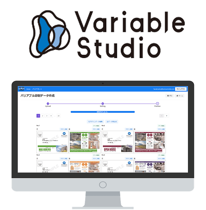 「Variable Studio」はCSVファイル等のデータベースを読み込むことで、DMや名刺、ナンバリングをはじめとしたバリアブル印刷物において、レイアウトから面付け、出力までの一連の作業を自動的に行うクラウド型のソリューションです。