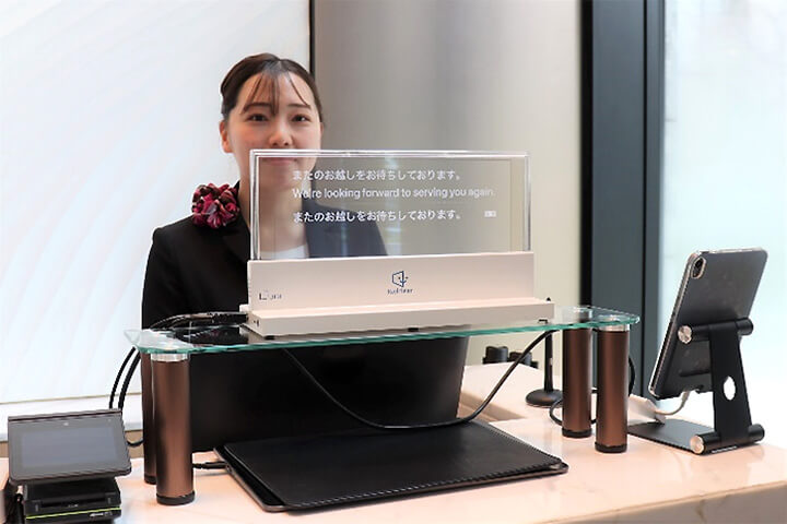 <京王プレリアホテル札幌のフロントカウンターでKOTOBALと透明ディスプレイを利用>