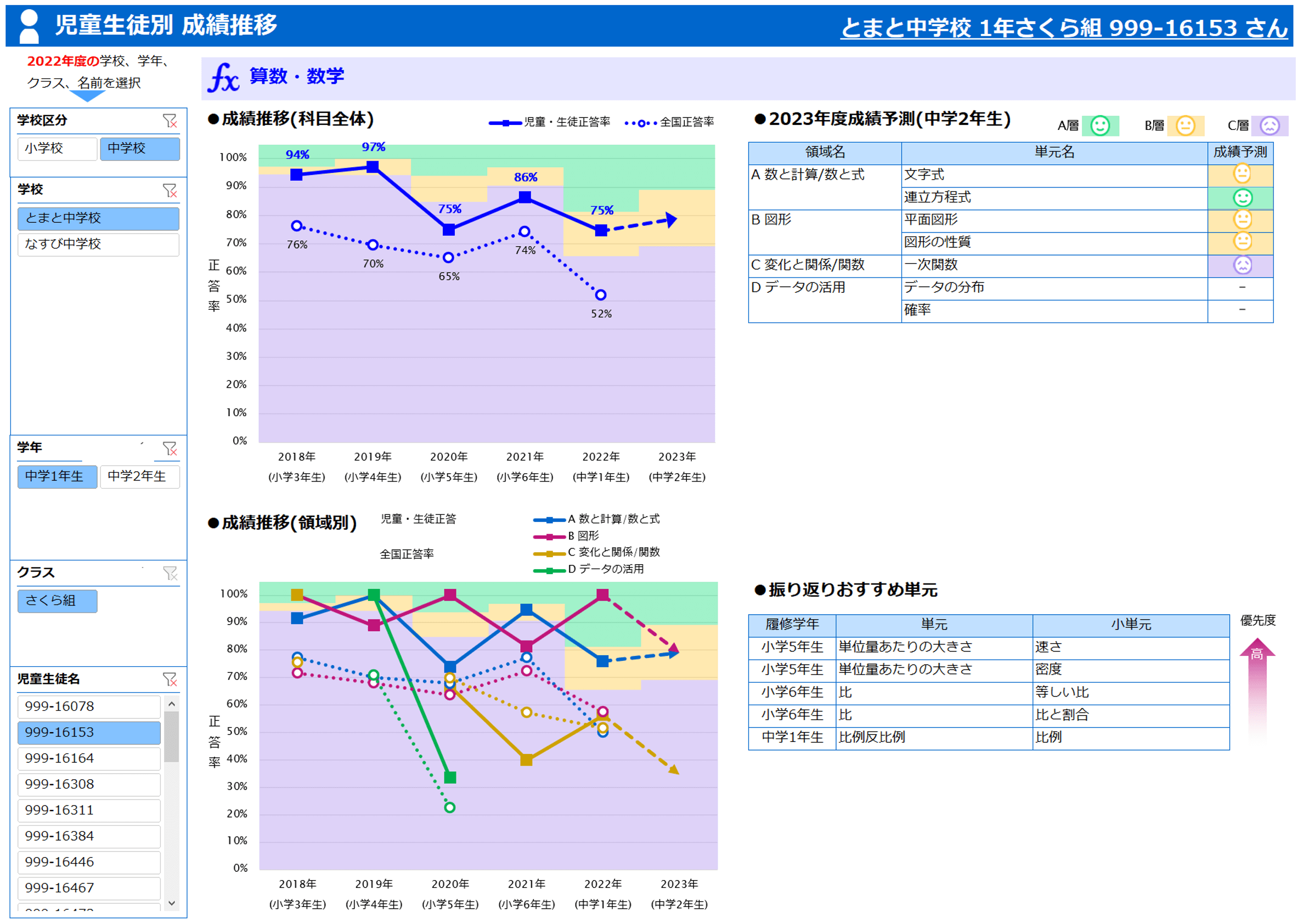 2023年度のデータ分析の対象は市内の小学校281校、中学校127校の小学3年生から中学3年生約11万人分の過去4年間分のデータで、約1カ月半で分析が完了しました。分析レポートは児童生徒一人ひとりの4年間の経年変化や得意・不得意の単元やポイントを数値や文章を用いて可視化しました。