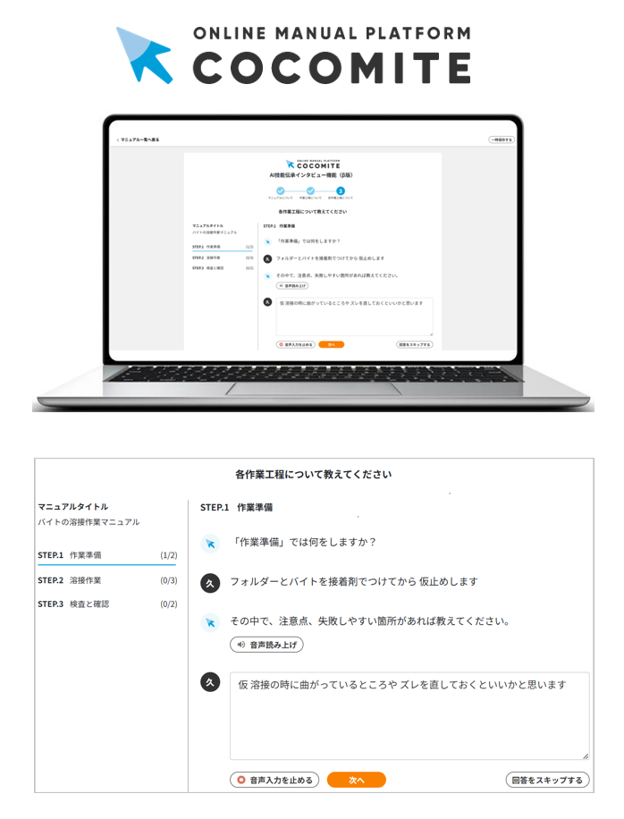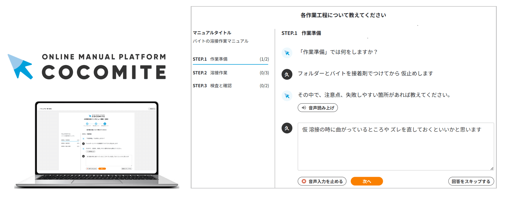 コニカミノルタジャパン株式会社(本社:東京都港区、代表取締役社長:一條 啓介、以下 コニカミノルタジャパン)は、個のナレッジ共有とスキルの見える化により企業の生産性向上という社会課題の解決を目指す、オンラインマニュアル作成・運用サービス「COCOMITE(ココミテ)」において、「AI技能伝承インタビュー」機能を開発しました。本機能は、認知科学を活用した生成AIが、技能者に高度技能や熟練技術についてインタビュー形式でヒアリングを行い、その音声データをもとにマニュアル化までを自動で行うものです。ベータ版(試用・評価版)の提供開始にあたり、産学官連携にて静岡県富士市の製造業2社と常葉大学の認知科学専門家との実証実験の結果を踏まえて開発を進めてきました。