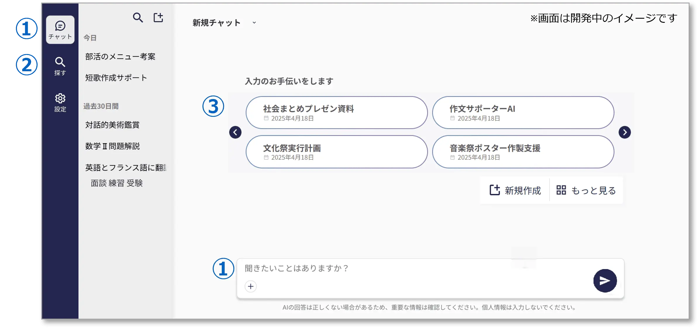- チャット機能…生成AIとの対話や画像の入力が可能