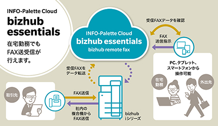 さらに、クラウドサービス「bizhub essentials」を利用いただくことでテレワークや外出時でもFAX送信ができるので、滞りなく業務を行うことができます。