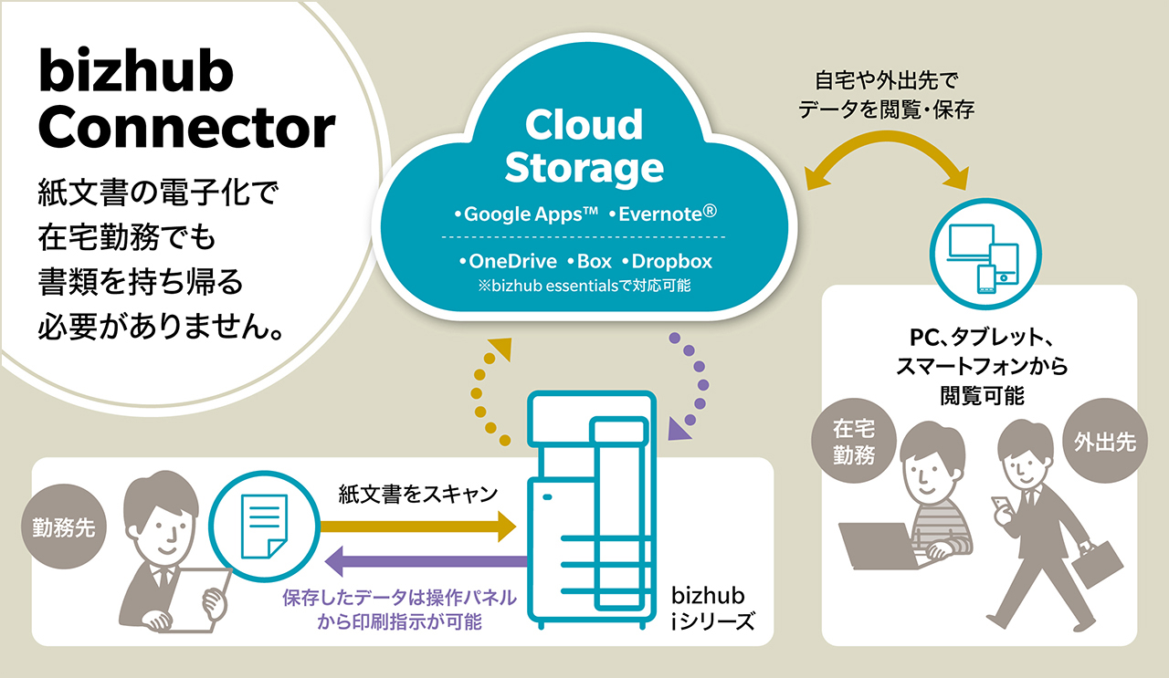 「bizhub Connector」を使うとbizhub i シリーズでスキャンした書類をクラウドストレージに直接保管できます。ファイルサイズを気にせず、時間を問わず、テレワークや外出先など社外にいる時でもデータへアクセスできます。クラウドストレージの構築が大変なのでは?と思われるかもしれませんが、コニカミノルタへお任せください!ITツールに抵抗があるという場合でもサポートいたします。