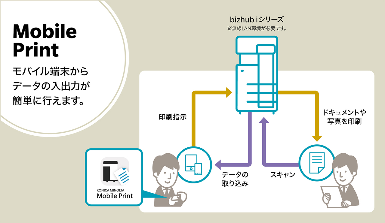 モバイル連携アプリ「Konica Minolta Mobile Print」を使うことで、スマートフォンで撮影した写真データをPCに保存する必要がなく、ダイレクトにbizhub i シリーズで出力することができます。また、bizhub i シリーズでスキャンしたデータはPCを経由せずにスマートフォンに直接保存することもできます。