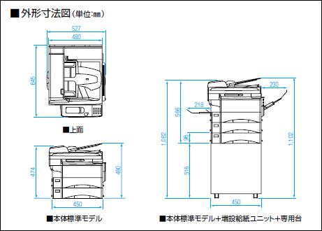 | 複写サイズ | 本体トレイ:B4、A4タテ、B5ヨコ、A5ヨコ 手差し:B4、A4タテ、B5タテ・ヨコ、A5タテ・ヨコ、郵便はがき、郵便往復はがき 不定形サイズ(幅:90~257㎜、長さ:140~364㎜)5種類登録可 |