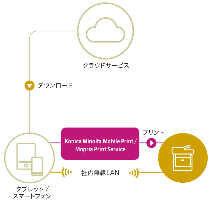 シンプルで直感的なユーザーインターフェイスで、モバイル端末とbizhubとを簡単に連携。クラウドストレージのドキュメントや写真の印刷がスムーズに行えます。