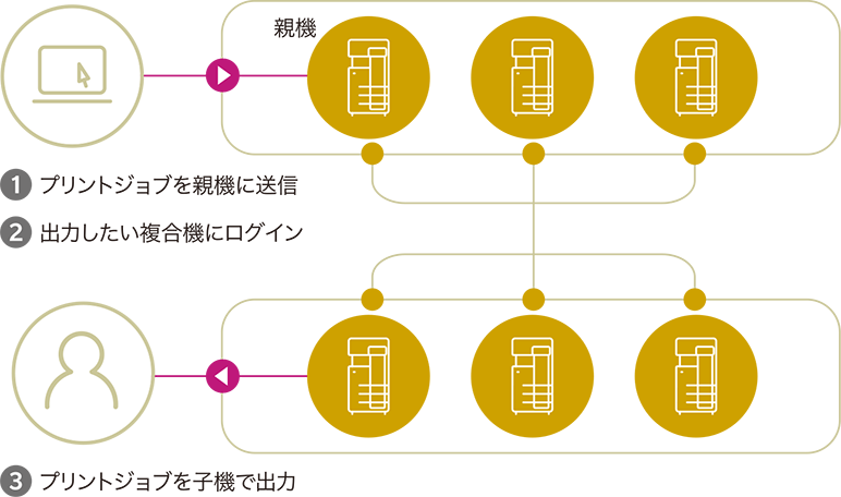 あらかじめ送信したプリントジョブをオフィスネットワーク内の任意の複合機から、認証後に出力させるユビキタスプリントをサーバーレスで実現。本機がユビキタスプリントの親機として、プリントサーバーに変わる働きをするため、低コストで手軽にサーバーレスユビキタスプリントのシステムを構築できます。また、サーバーレス複合機統合認証も導入するとユーザー認証用のサーバーも必要ありません。