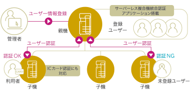 ユーザー情報を1台の複合機でまとめて管理。複合機が複数台ある場合も、1台(親機)にユーザーを登録すれば他の複合機(子機)でユーザー認証が可能。複合機のみでユーザー認証が可能なため、別途専用サーバーは必要ありません。サーバーに関する専門知識がなくても導入・運用いただけます。