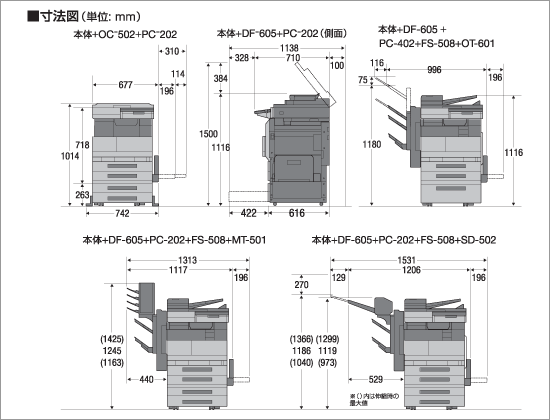 | 装着可能オプション | 増設排紙トレイ(OT-601)、パンチキット(PU-501) 中綴じユニット(SD-502)※3、メールビンキット(MT-501)※3 |