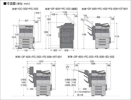 | 装着可能オプション | 増設排紙トレイ(OT-601)、パンチキット(PU-501) 中綴じユニット(SD-502)※3、メールビンキット(MT-501)※3 |