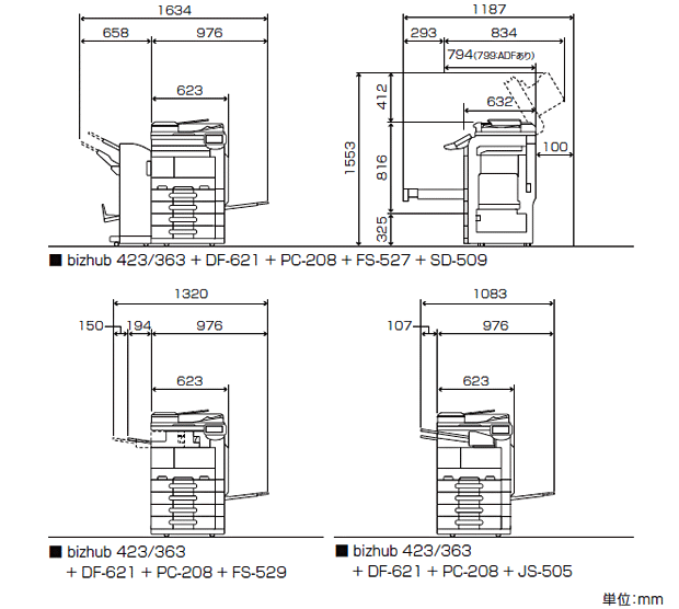 | 機械占有寸法(幅×奥) | 976×799mm(ADFあり) ※手差しの補助トレイを開いた状態 |