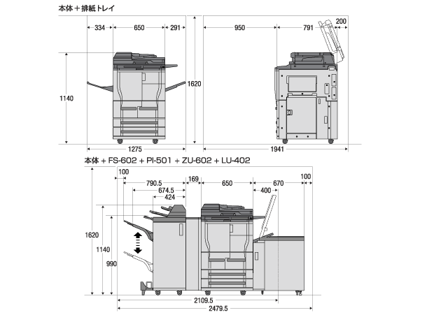 | 機械占有寸法(幅×奥行) | 1275×791mm(本体+DF+排紙皿、手差しを開いた状態) | ||