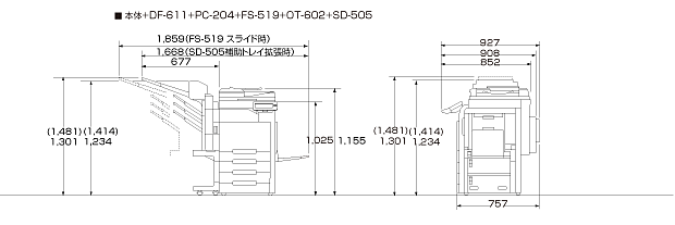 | 機械占有寸法(幅×奥行) | 991×852mm(手差しトレイを開いた状態) | ||