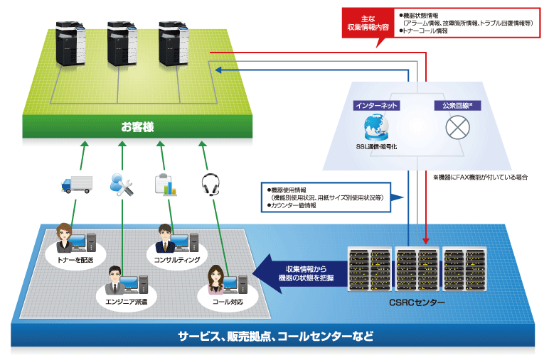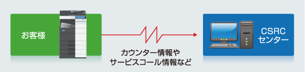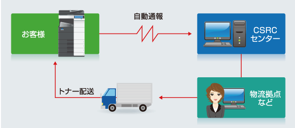 機器の状況を定期的に取得し、その情報に応じて点検訪問を行います。トラブル時には、自動でCSRCサーバーに通報し、機器修理のダウンタイムを最低限に抑えます。また、トナーを自動配送するサービスもご利用いただけます。