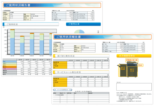 bizhub iCare Reportは、CSRCで取得した各種カウンター情報や紙詰まり・サービスコール情報など、必要な情報を抽出し、レポートを作成するシステムです。機器毎のご利用状況を月毎の推移でご確認いただけます。