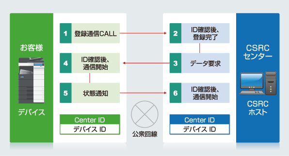 CSRCホストとデバイスの双方にあらかじめ登録したIDを使用。通信毎にホストの登録内容とデバイスの送信内容とが一致するかを確認し、通信を行います。