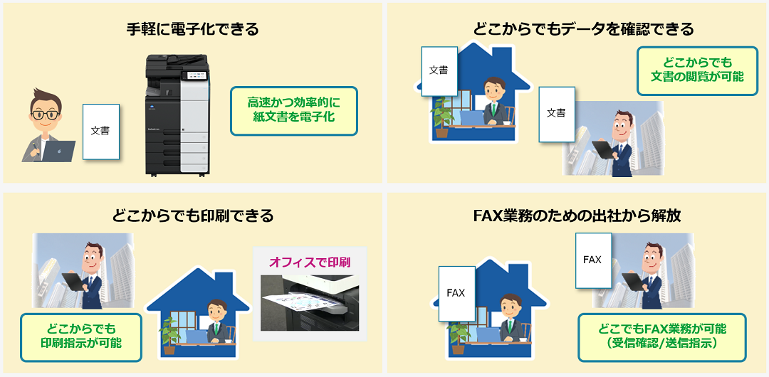 身近な複合機を活用して簡単に新しい働き方の環境づくりをする方法をご紹介しました。紙の書類を効率的に電子化することで、会社に出社しないと業務が止まるということが減り、どこでも働ける環境づくりが推進されます。