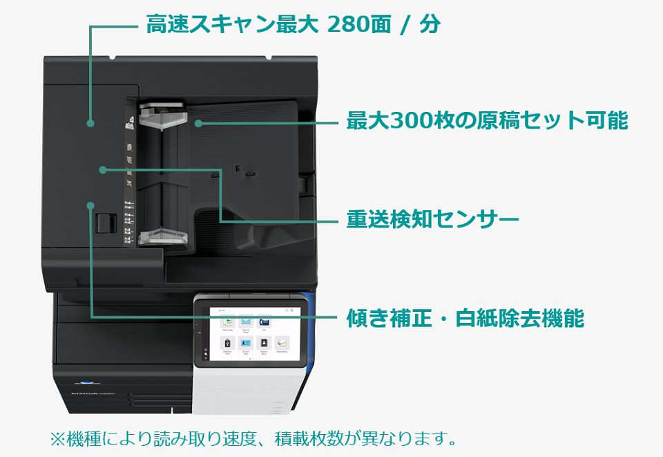 大量な書類のスキャンも効率的に行えるのが、コニカミノルタの複合機bizhub iシリーズの特長です。